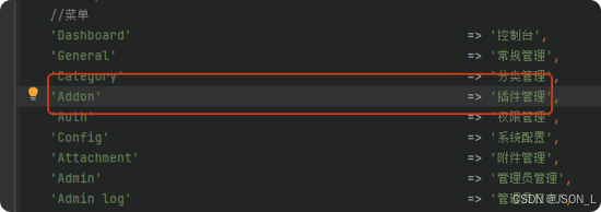 在admin/lang/zh-cn.php中,有对该菜单标题的解析,所以在菜单规则和列表中能够显示相应的语言,如下: