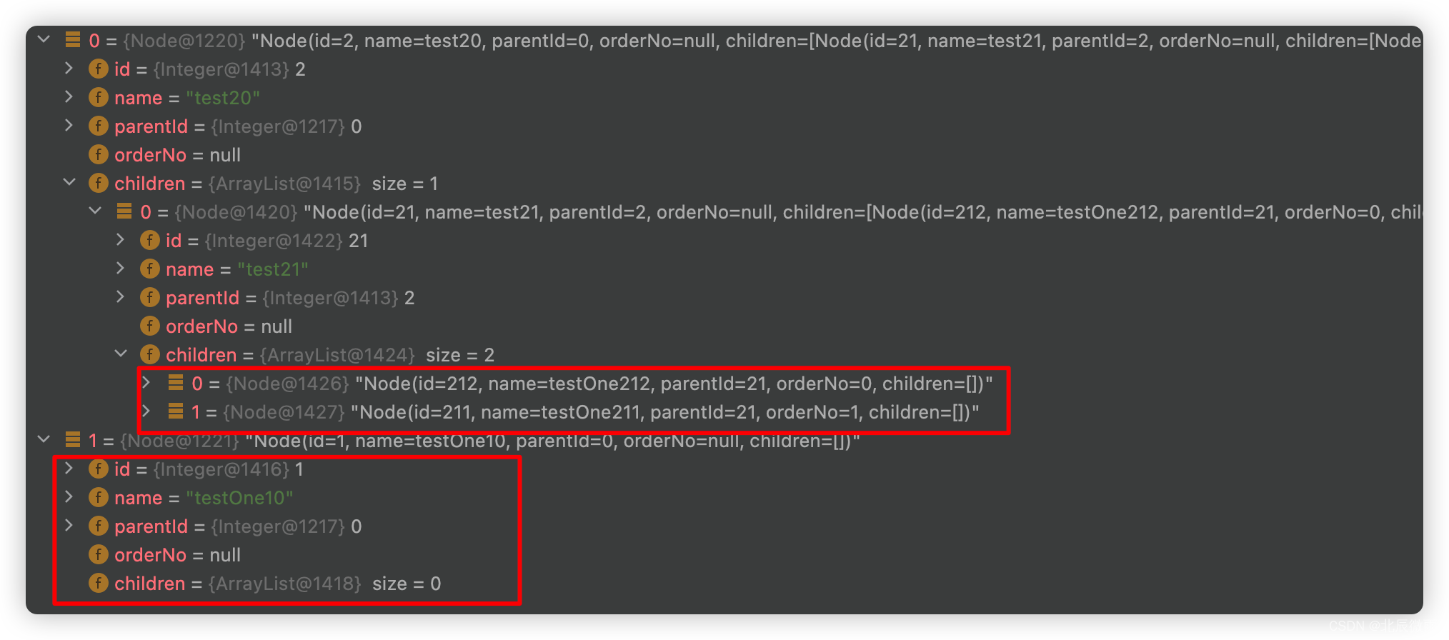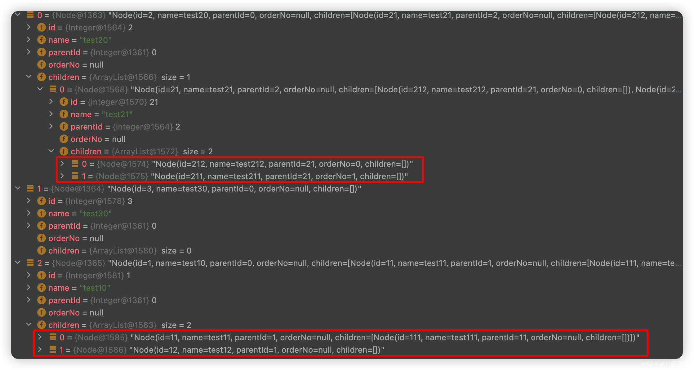 String json = "[{\"children\":[{\"children\":[{\"children\":[],\"id\":111,\"name\":\"test111\",\"parentId\":11}],\"id\":11,\"name\":\"test11\",\"parentId\":1},{\"children\":[],\"id\":12,\"name\":\"test12\",\"parentId\":1}],\"id\":1,\"name\":\"test10\",\"parentId\":0},{\"children\":[{\"children\":[{\"children\":[],\"id\":211,\"name\":\"test211\",\"parentId\":21,\"orderNo\":1},{\"children\":[],\"id\":212,\"name\":\"test212\",\"parentId\":21,\"orderNo\":0}],\"id\":21,\"name\":\"test21\",\"parentId\":2}],\"id\":2,\"name\":\"test20\",\"parentId\":0},{\"children\":[],\"id\":3,\"name\":\"test30\",\"parentId\":0}]";