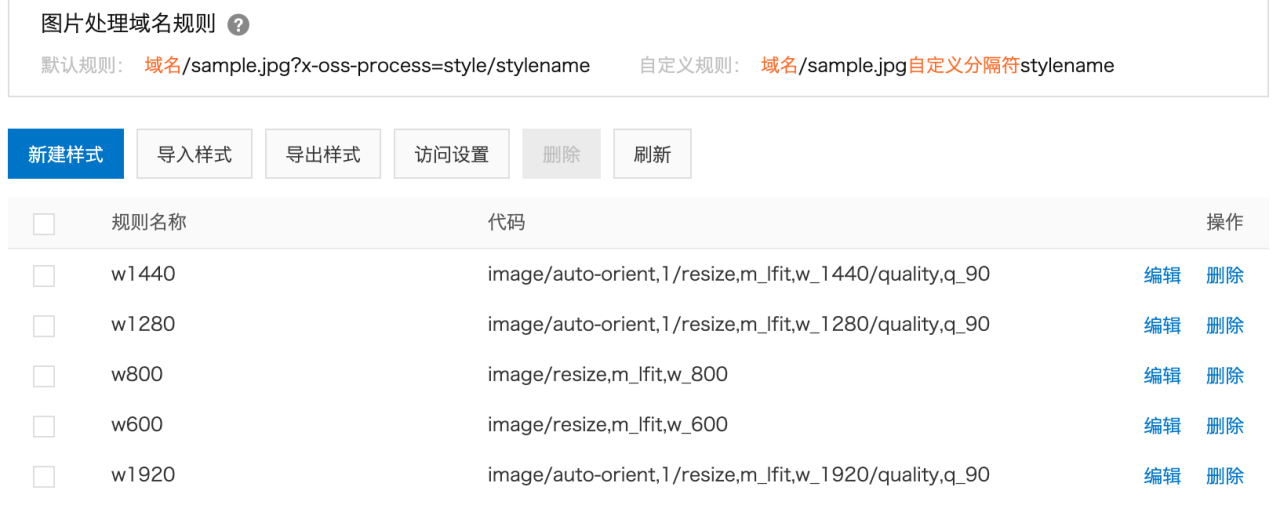 网址后缀:这是阿里云OSS的一个很好用的功能,用于图片处理(如缩略图)。需要去OSS的 图片处理规则 中创建样式。以下是我设置的规则,后缀