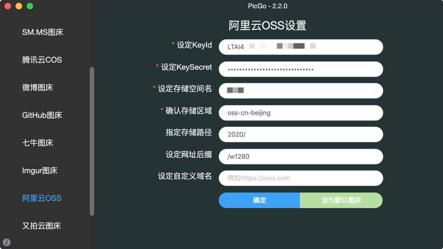 通过自定义链接格式,可以直接生成符合需要的Markdown代码,方便粘贴。如我喜欢通过OSS将原始图片等比缩放到宽度<=1280px,并将图片缩放50%来优化显示效果及速度,配置如下: