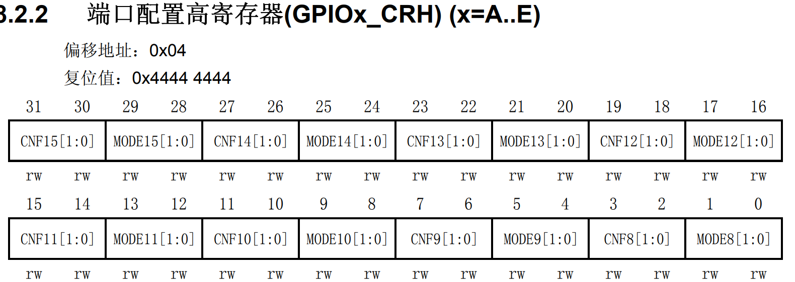 CNF13 要设置为推挽输出模式,即00. MODE 要配置为输出模式,最大速度 50MHZ 11。所以寄存器赋值 0x0030 0000