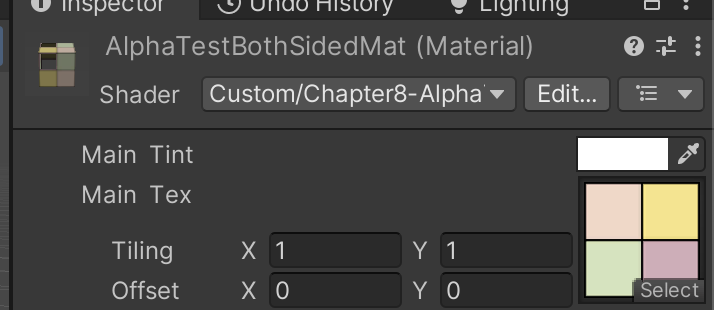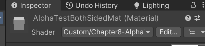我们新建了一个场景,在本章资源中,该场景名为Scene_8_7_1,场景中同样包含了一个正方体,它使用的材质和Unity Shader分别名为AlphaTestBothSidedMat和Chapter8-AlphaTestBothSided。