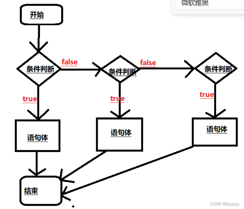 4.如果中间有一个if else里小括号的条件是true,则会执行它大括号内的语句体,后面的if else就不会执行,就直接跳出if-if else-if else....else语句。