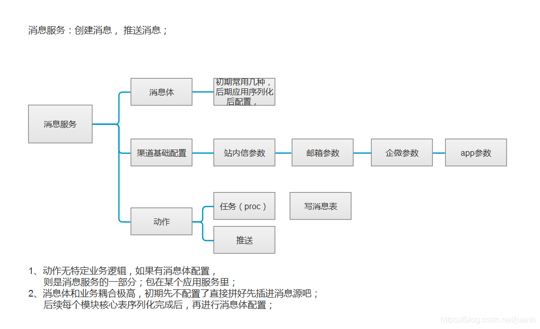 消息体 根据渠道不同也不同; 消息体有微信类的, 邮箱类的等; 与业务逻辑耦合较大, 配置拼好先插进对应渠道消息表;