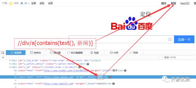 例如在百度首页,我们使用contains定位包含“新闻”文本的元素。