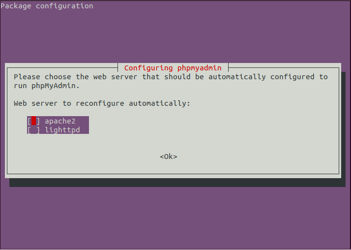 如果提示您选择web服务器,请按SPACE键在apache2旁边放一个星号[*],然后按TAB键突出显示OK并按ENTER键.如下图: