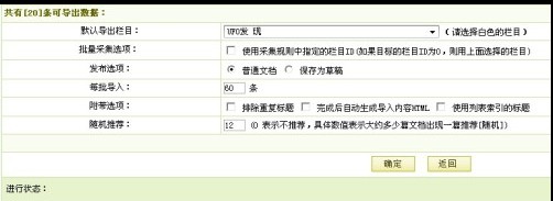 首先选择要导入到的栏目,按“请选择”那里即可在弹出的窗口中选择你需要导入的栏目发布选项这里一般默认即可,除非你不想马上发布。每批导入默认是30条,这里修改与否都无所谓,附带选项一般选“排除重复标题”,至于自动生成HTML那个选项建议先别生成,因为我们还要去批量提取摘要和关键字。
