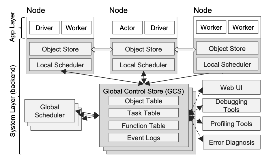 系统层:系统层由3个主要组件组成:Global Control Store(GCS)、一个分布式调度器,和一个分布式的对象存储。所有组件都是可以水平扩展和错误容忍的。