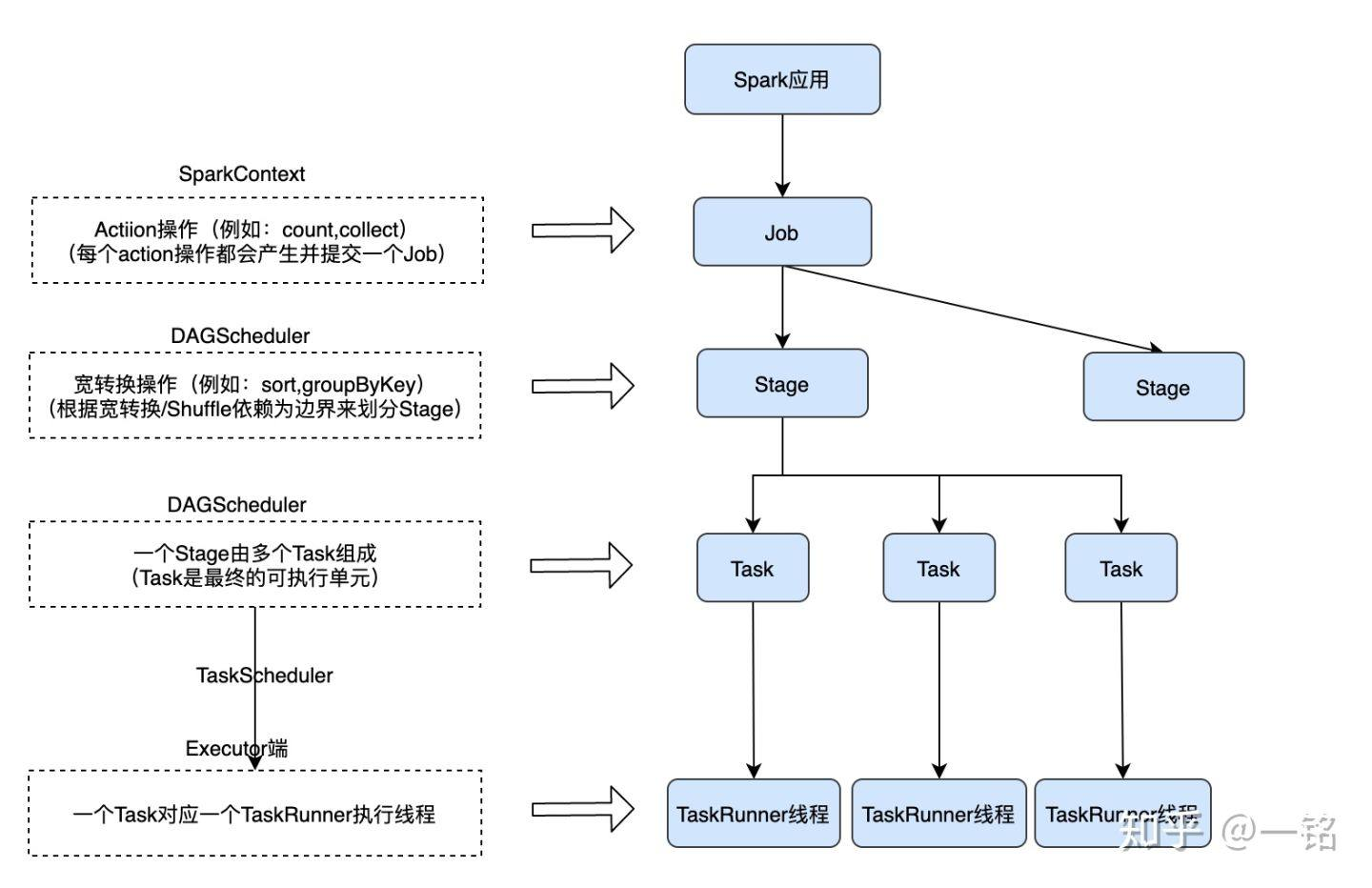 这里我们需要注意的是,前面所说的调度过程全部发生在Driver节点,远端的Executor作为执行器,只负责执行独立的Task,而对整个Job是完全无感知的。