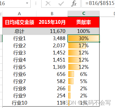 如下图所示,最终的产出结论类似于:“2016年11月的日均成交金额为11,670,其中贡献最大的是行业1,一共贡献了3,488,贡献率为30%。”