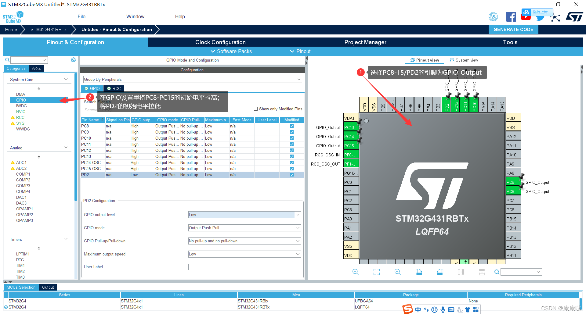 本文介绍了蓝桥杯G4中LED的控制原理,通过74HC573D芯片实现。LED亮灭由GPIO_PIN_RESET和GPIO_PIN_SET控制。详细步骤包括工程配置、启动文件处理及程序实现。示例代码展示了如何点亮LED,以及如何用函数控制多个LED,并给出了简单的流水灯程序实现。