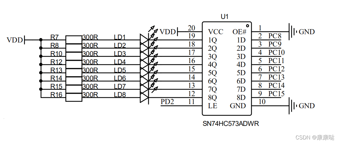 通过打开G4的原理图,我们可以看到有关LED的引脚为PC8-PC15,当输出为低电平(GPIO_PIN_RESET)时,灯亮;输出为高电平(GPIO_PIN_SET)时,灯灭。74HC573D 的控制逻辑为:当 LE 为低电平时,无论在数据输入引脚上的电平如何变化,输出保持不变。当 LE 为高电平时,数据输出引脚上的电平与输入引脚上的一致。当 LE 再次为低电平后,数据输出引脚上的电平就被锁定了。因此,LED 的控制逻辑为:先输出要显示的数据,然后将 LE(PD2)拉高,然后马上拉低(由于程序执行有时间,这样会在 LE 上形成一个高电平的脉冲)。