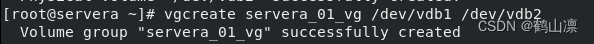 使用vgcreate创建一个名为servera_01_vg的新VG,它的大小是/dev/vdb2和/dev/vdb1这两个pv的大小之和
