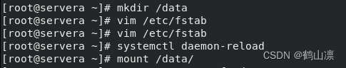 在data处创建挂载点,在servera上在/etc/fstab的末尾添加一段话