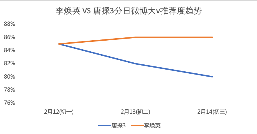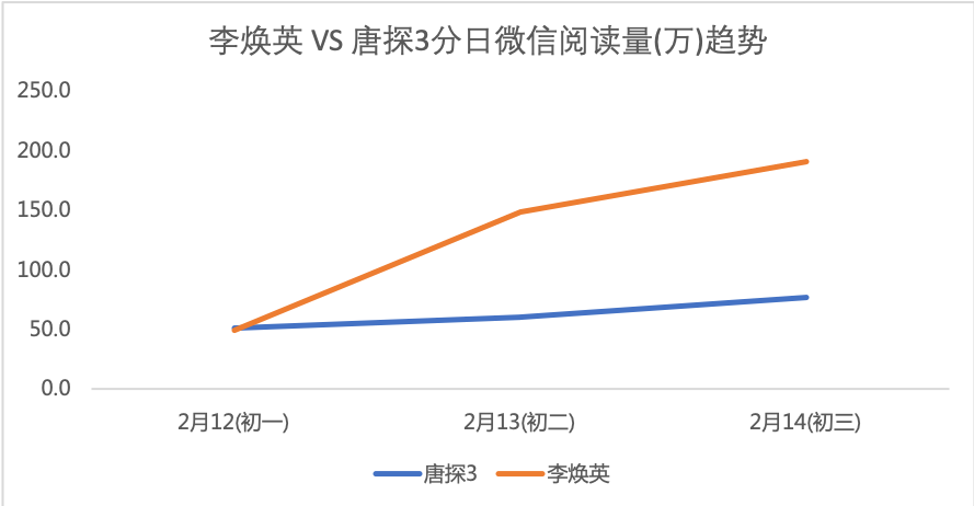 可以看到,在最开始,微博大v对两部电影的推荐度是一样的,但是之后对唐探3的推荐度大幅降低;微信文章阅读量也是类似情况,在最开始,两部电影相关的文章阅读量基本持平,之后关于李焕英的文章阅读量出现了大幅的上涨。
