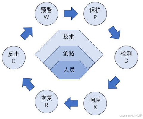6个环节包括:预警、保护、检测、响应、恢复和反击。模型蕴涵的网络安全能力主要是预警能力、保护能力、检测能力、响应能力、恢复能力和反击能力。