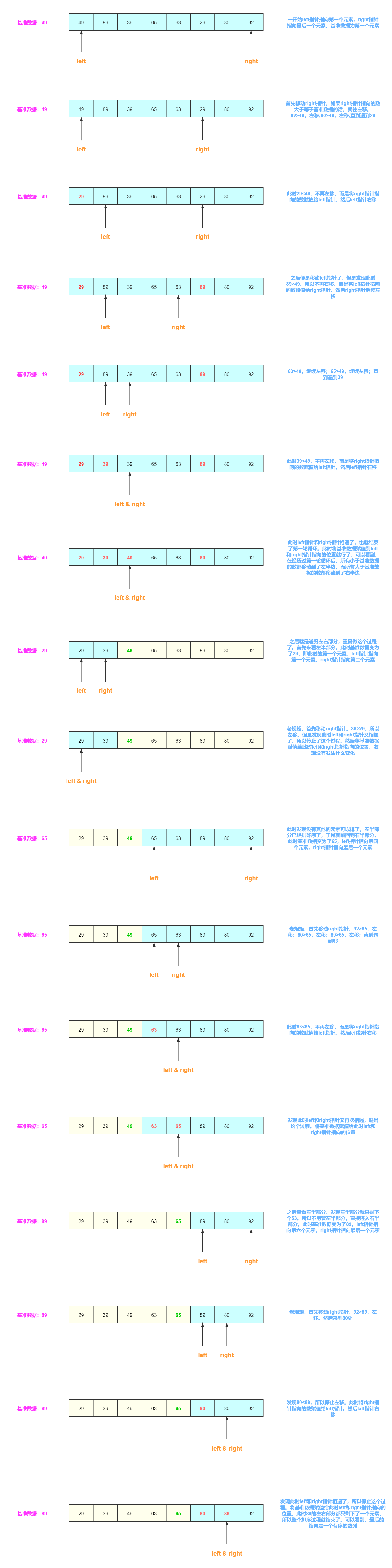 拿left位置元素和基准数据进行比较。如果小于等于,则将left指针右移,比较下一位元素;而如果大于就将left指针处数据赋给right指针处,right指针-1,之后开始比较right指针处数据…重复这个过程。
