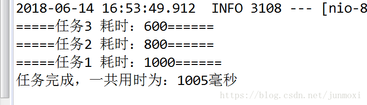 任务1 睡眠了 1000毫秒,任务2 睡眠了800毫秒,任务3 睡眠了600毫秒,如果是同步执行的话三个任务完成应该是2400毫秒,而这里只使用了1005毫秒,说明我们的任务执行确实是异步执行