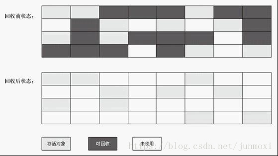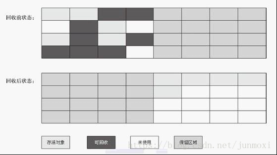 所以老年代中使用的时候分配整理算法,它的原理和分配清除算法类似,只是最后一步的清除改为了将存活对象全部移动到一端,然后再将边界之外的内存全部回收。
