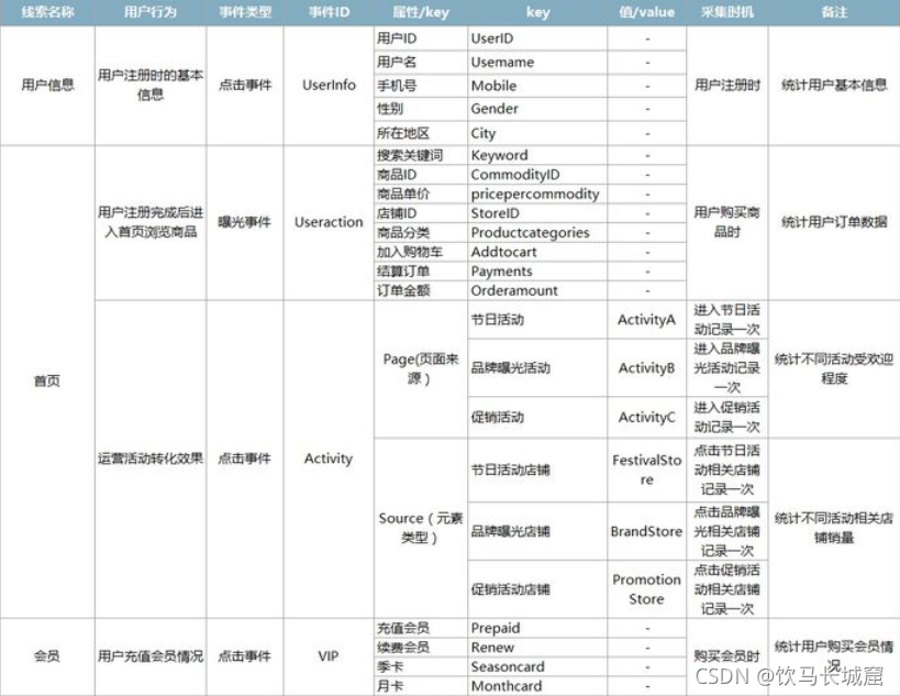 一般要包括,埋点名称,采集的类别,用户行为类别,采集时间,采集指标,以及各种id等技术必须字段。 如下: