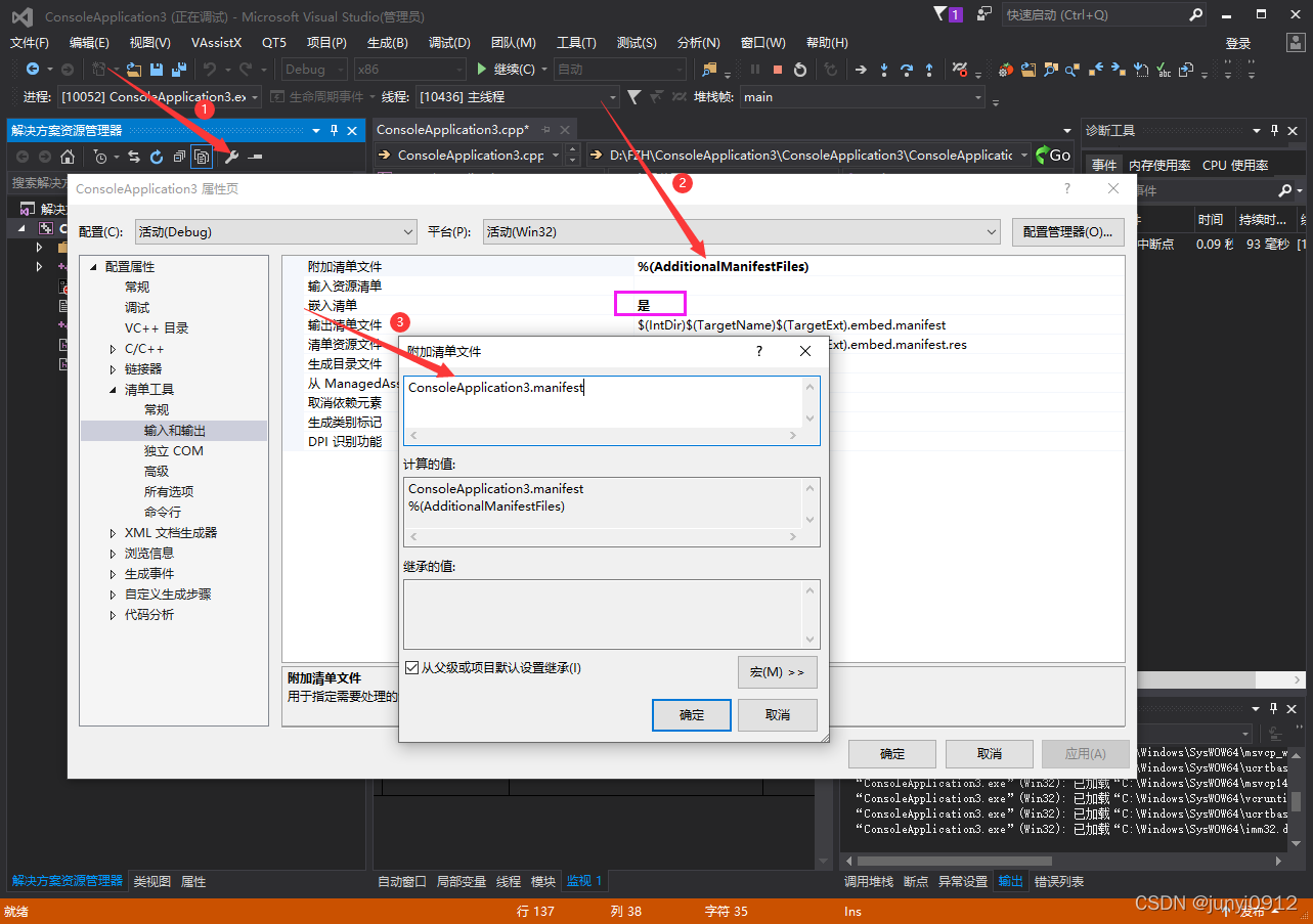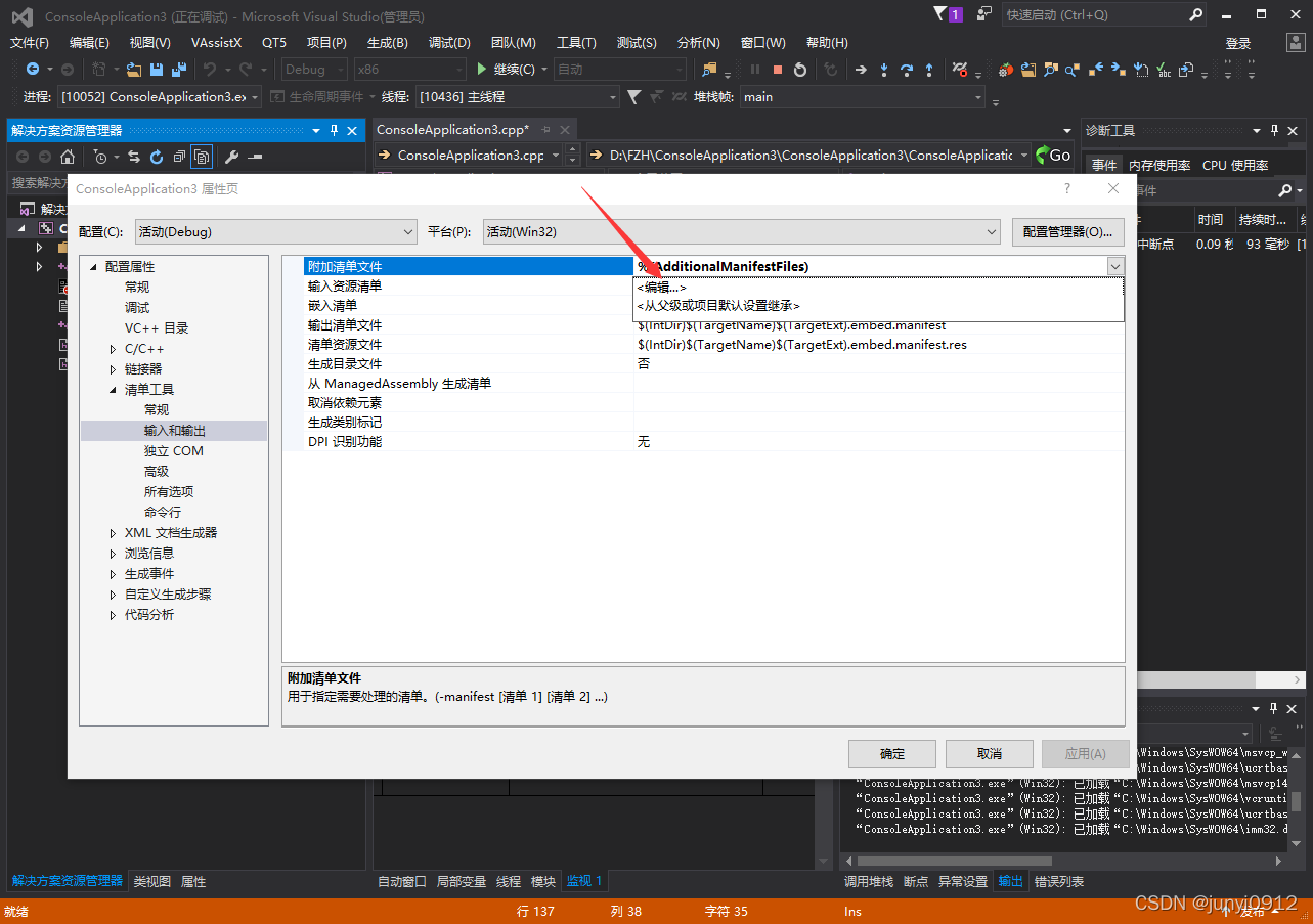第一步:VS2015 ->解决方案资源管理器->属性->配置属性->清单工具->输入和输出->附加清单文件->编辑:
