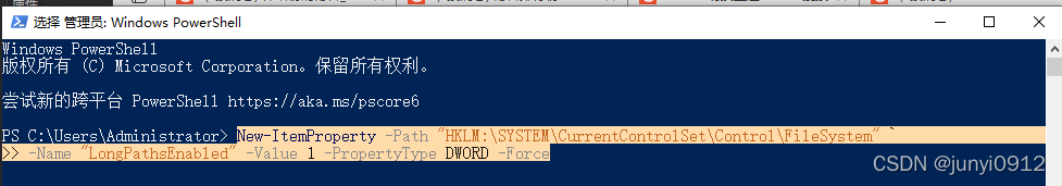 第二步:打开了Power Shell后执行这个命令: New-ItemProperty -Path "HKLM:\SYSTEM\CurrentControlSet\Control\FileSystem" `