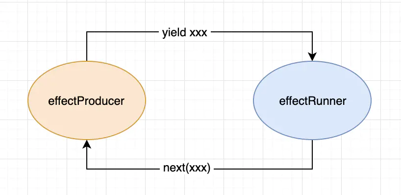 Saga就是利用了这一点,而且不止这样,Saga中间件内部有一个驱动函数(effectRunner),它里面生成一个遍历器对象来不断地消费生成器函数(effectProducer)中的effect指令,完成指定的任务并递归循环下去。(这时候你可能会想到TJ大神的CO库)