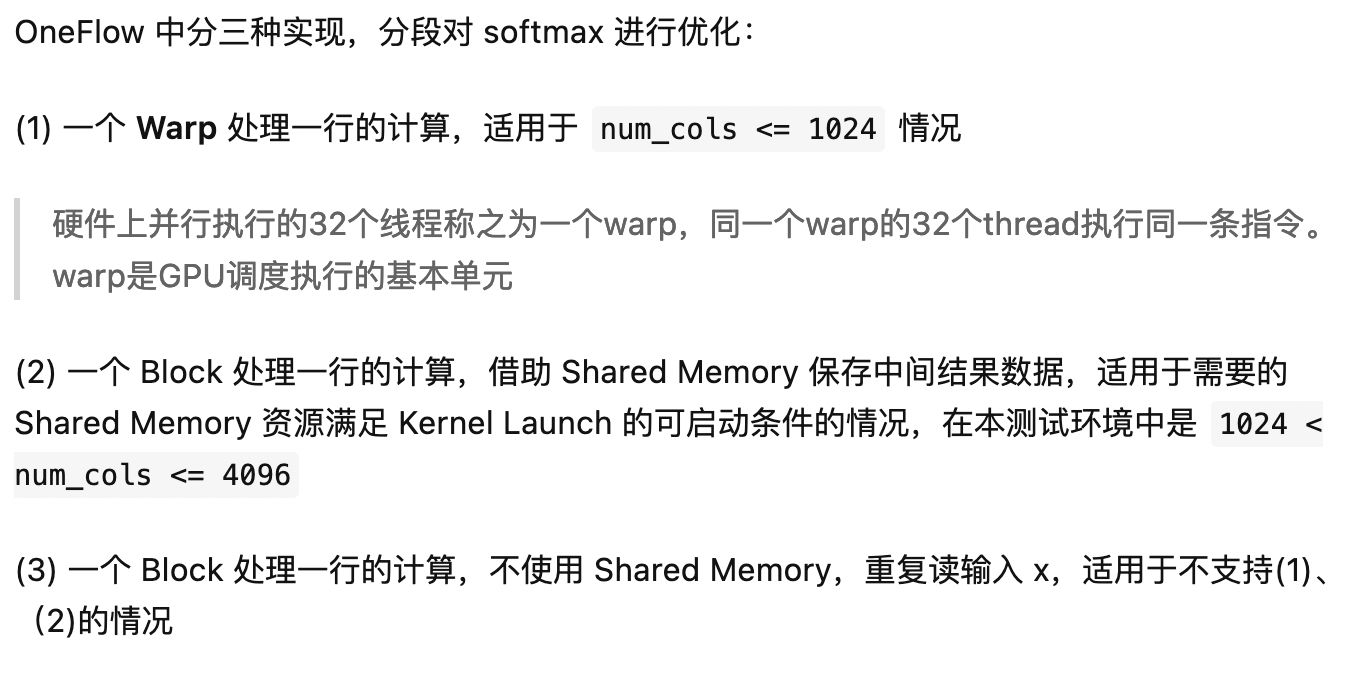 在 如何实现一个高效的Softmax CUDA kernel?——OneFlow 性能优化分享 (https://zhuanlan.zhihu.com/p/341059988) 这篇文章中已经较为详细的阐述了 OneFlow 的 softmax cuda kernel的优化技巧,我这里就不重复讲解其中的内容了。不过当时阅读这个文章的时候感觉对其中一些代码细节以及用法还有一些疑问,本次我在重新阅读的过程中为 oneflow 的 softmax cuda kernel添加了详细的注释以及用法示例。oneflow softmax cuda kernel要求输入数据的shape为(num_rows, num_cols),然后根据 num_cols 的大小进行分段处理: