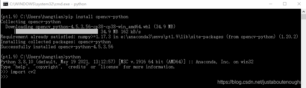 该博客介绍了如何在Anaconda环境下安装OpenCV。首先,选择相应的环境并打开终端,然后通过pip安装opencv-python。安装成功后,通过运行python并导入cv2模块进行验证,如果没有报错则表明安装完成。若网络不佳,可以从官方网站下载离线包,使用pip安装下载的文件来完成安装。