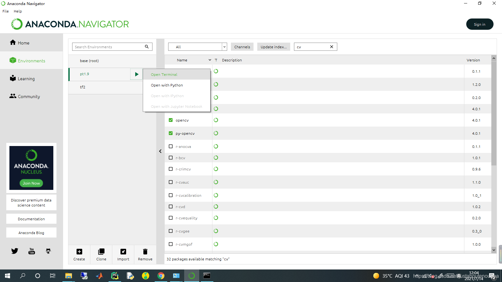 在anaconda中,选择要安装opencv的环境,并打开终端。