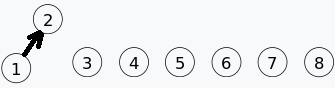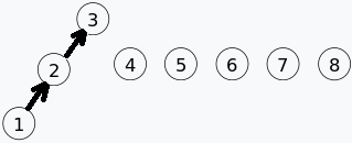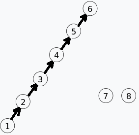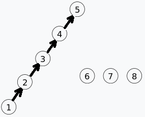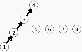 在并集的时候,我们每次都是讲元素 x 的父节点设置为 y。使用这样的模板来实现并集的时候,可能出现一个极端的样例。我们用数据来说明,同样我们的数据集是 1 ~ 8。
