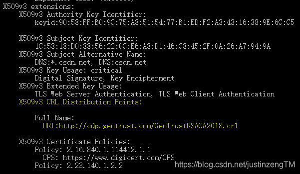 如果你的证书是cer格式的,可以先格式转换成pem格式,然后继续使用openssl命令行,打开这个pem格式的证书。查看证书可以看到很多的信息,如服务器公钥,使用的签名算法等,我们要寻找的是它的CRL分发点,即找到CRL Distribution Points: