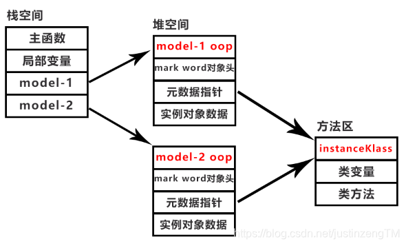 JVM中为每一个Java类都创建一个oop-kalss模型与之对应,来表示每一个类里的对象实例信息,例如每创建一个新的对象,JVM都会为其创建一个opp(ordinary object pointer普通对象指针)对象和klass对象。