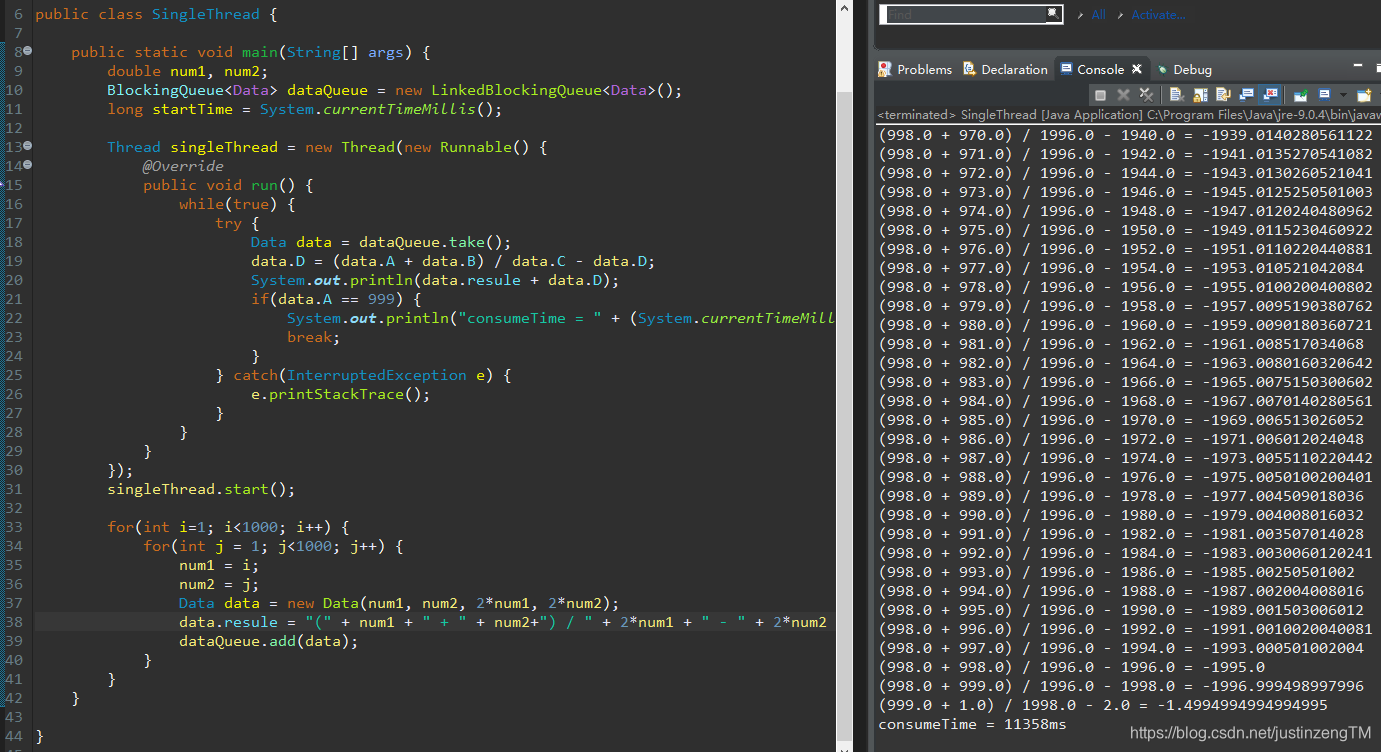 在加法线程中,我们用一个BlockingQueue队列保存主线程传进来的Data数据,然后使用take()方法(还记得这个方法吧?就是当BlockingQueue队列为空时会进行线程等待。)从队列中拿出一个Data数据,把里面的double变量A和B相加,结果放到B总,然后把Data数据传到第二步,即除法线程中去。