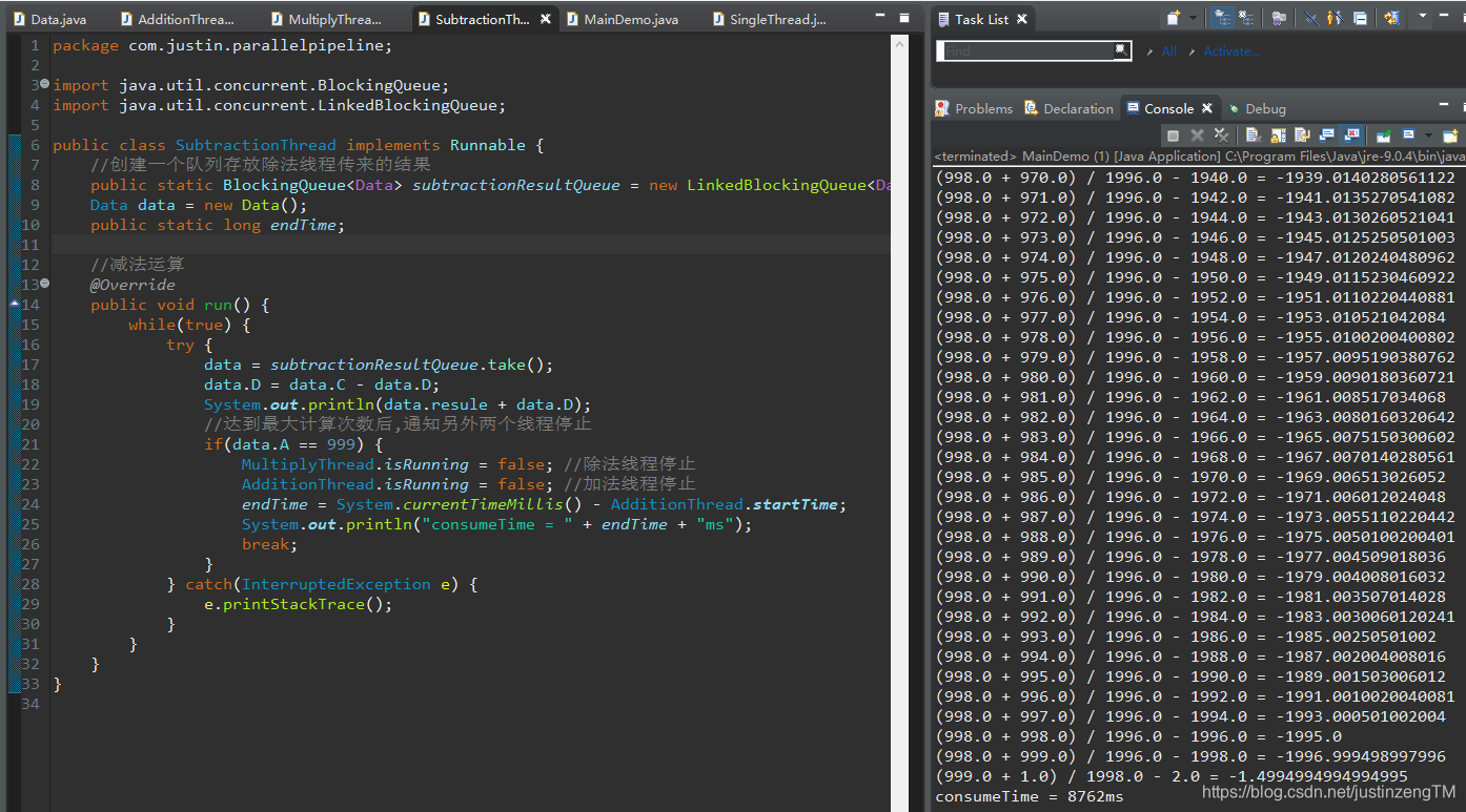 除法线程类似,也需要一个BlockingQueue队列additionResultQueue来接收加法线程传过来的第一个结果,结果存放在了data.B变量中。接着除法线程要做的就是take()方法拿到这个数据,然后运算B/C(此时变量B的值是(A+B)),除法结果存放到变量C中,最后再传递到减法线程。