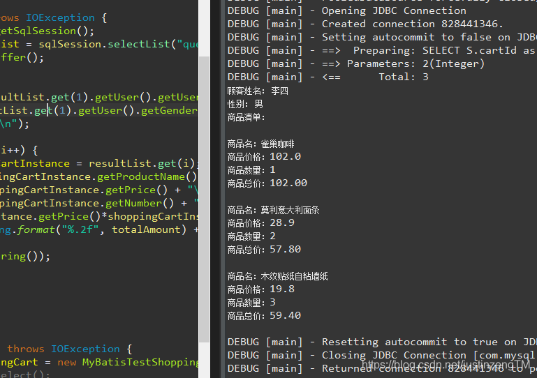 由于购物车上的商品可能不止一个,所以第40行用列表List<JavaBean>来接收返回结果集,每一个ShoppingCartInstance实例对象都是一个商品清单,清单上除了商品信息外,还有购买该商品的部分顾客信息,我们的需求是查询出某一id的用户的购物信息,所以其实对象里的User实例都是一样的,第44-45行输出顾客信息,只需获取一次即可,ShoppingCartInstance类中有嵌套的User类实例,并且有对该对象的get()和set()方法,所以可以上述44-45行的方法获得user对象,从而获得里面的信息。