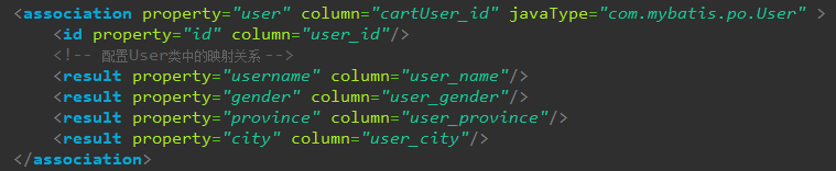 在购物车查询包装类中,我们让这个类继承ShoppingCart类,这样就能获得购物车类的所有属性,也就是能映射接收查询结果集中的购物信息。接着我们在包装类中,嵌套一个User类的实例对象,这个user对象就是负责映射接收返回结果集中的顾客信息数据。这样做可以吗?可以,得益于resultMap中的association标签,来看看这个包装类的SQL映射配置文件怎么写: