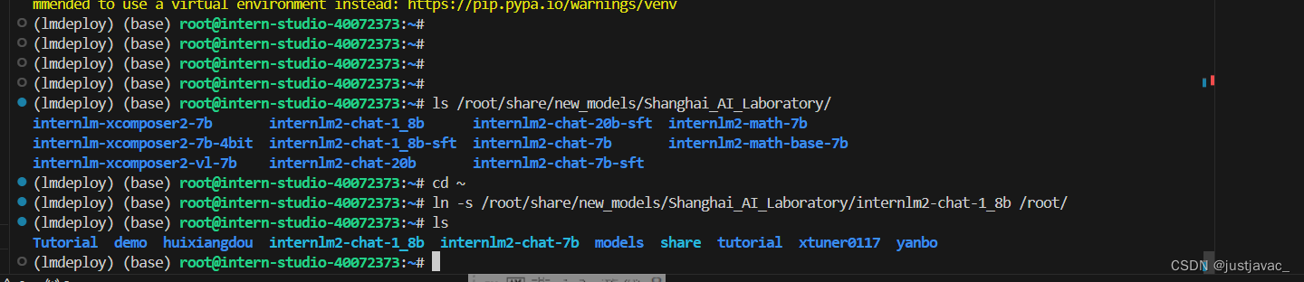 ln -s /root/share/new_models/Shanghai_AI_Laboratory/internlm2-chat-1_8b /root/ # cp -r /root/share/new_models/Shanghai_AI_Laboratory/internlm2-chat-1_8b /root/