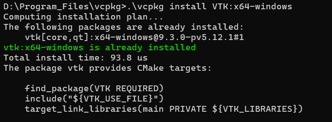 VTK有两种版本,无QT版和有QT版,使用vcpkg安装的是无QT版,输入下面的命令安装VTK无QT版,大概需要半小时及以上的时间