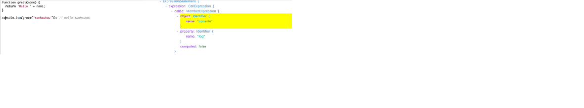 console.log 是MemberExpression的一部分,拥有一个叫"console"的object,和叫"log"的property。