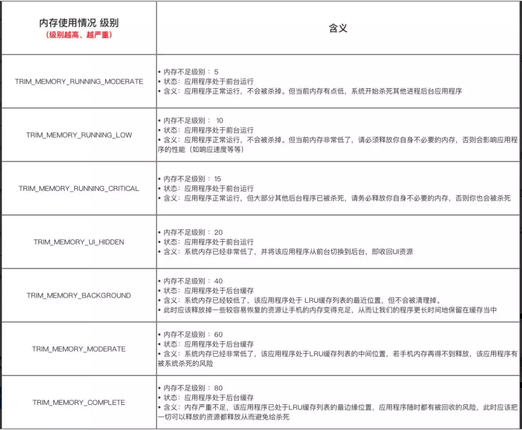 其中附上一张来自Carson_Ho总结的 onTrimMemory 相关内存级别的说明如下: