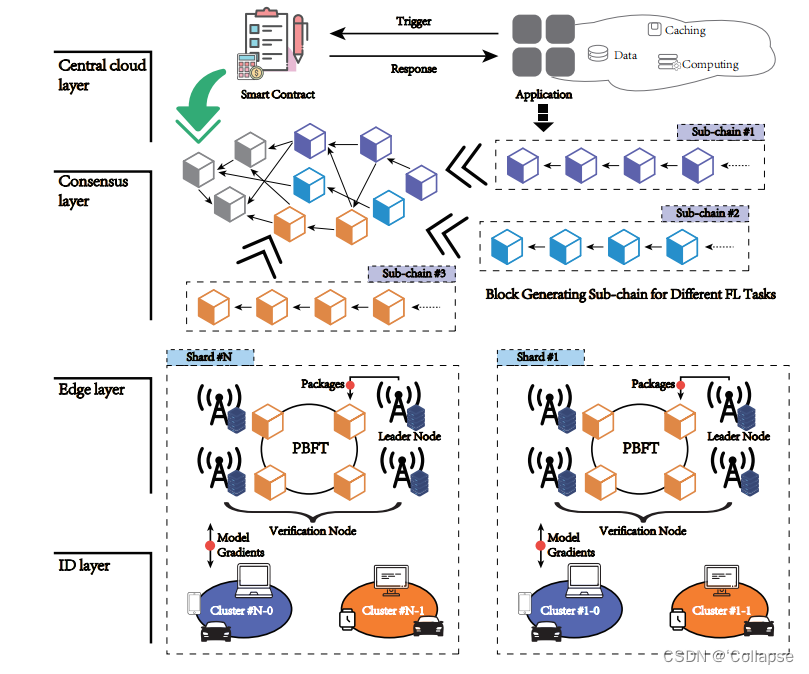 中心云层:包含一个中心云,协调FL任务交付、生成智能合约、成果验证