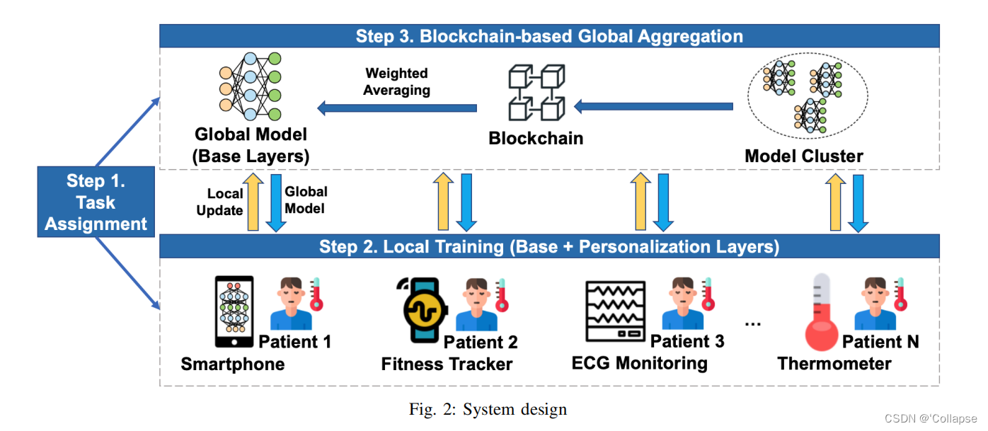系统工作流程分三步:任务分配、局部训练(基本层+个性化层)、全局聚合