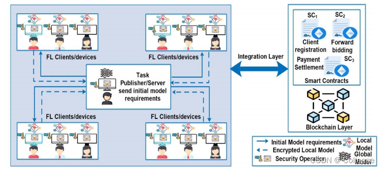提出了基于区块链的优化客户端选择方案和隐私保护框架。该系统由服务器、客户端、集成层和区块链层组成