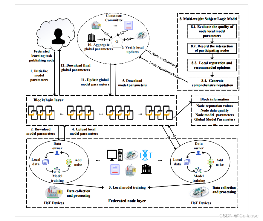 共识层:包含主链层和子链层。主链层用于发布FL任务。子链层由多个独立完成FL任务的部分组成。每个部分包括leader节点和验证节点。采用PBFT共识,更新局部模型梯度信息。