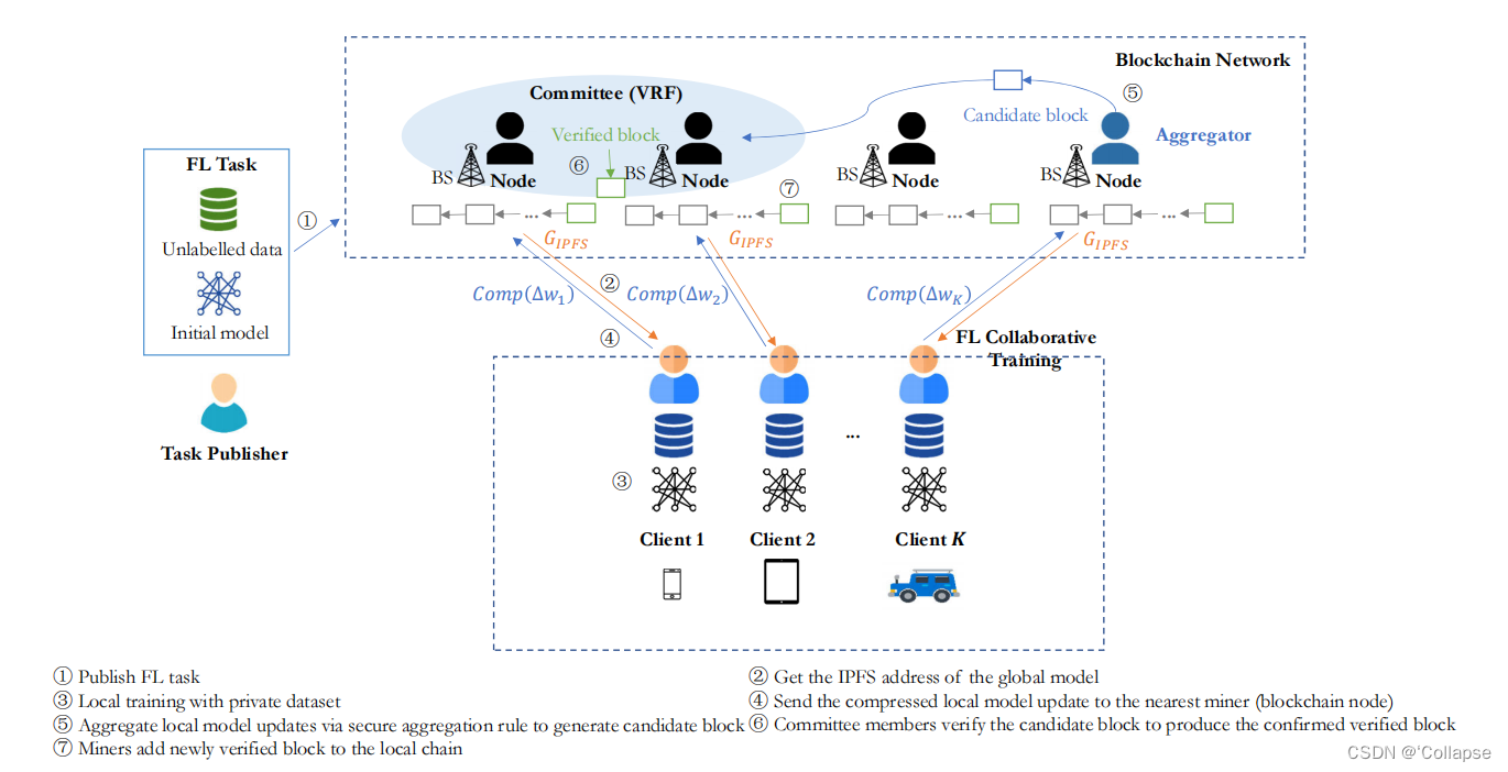6.全局模型的下载和更新:每个被选中的客户端从块中下载聚合的模型,并在下一轮学习之前执行更新
