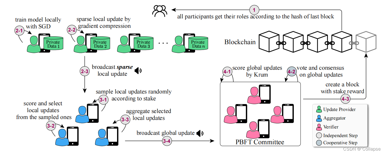 步骤6:委员会表明“是”或“否”投票来验证全局模型是否正确聚合。如果超过2/3的委员会通过,则将它视为一个经过验证的块并将其传播到网络。