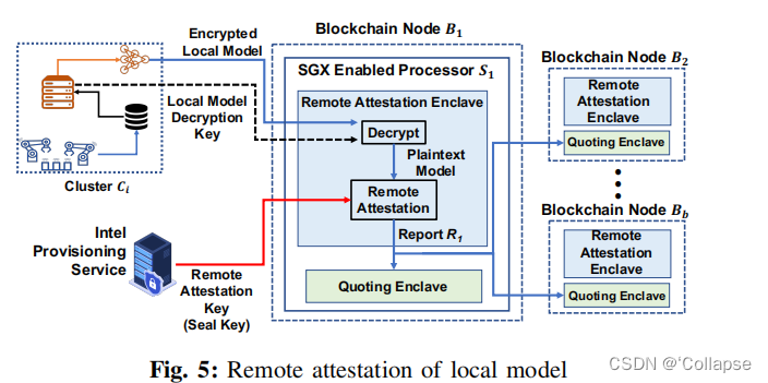 区块链向Si提供加密的本地训练模型,加密方法使用对称加密。在Si中使用FedAVG算法进行聚合。聚合完成后Si生成一个远程认证Ri,生成的Ri可以用于验证聚合得到的模型