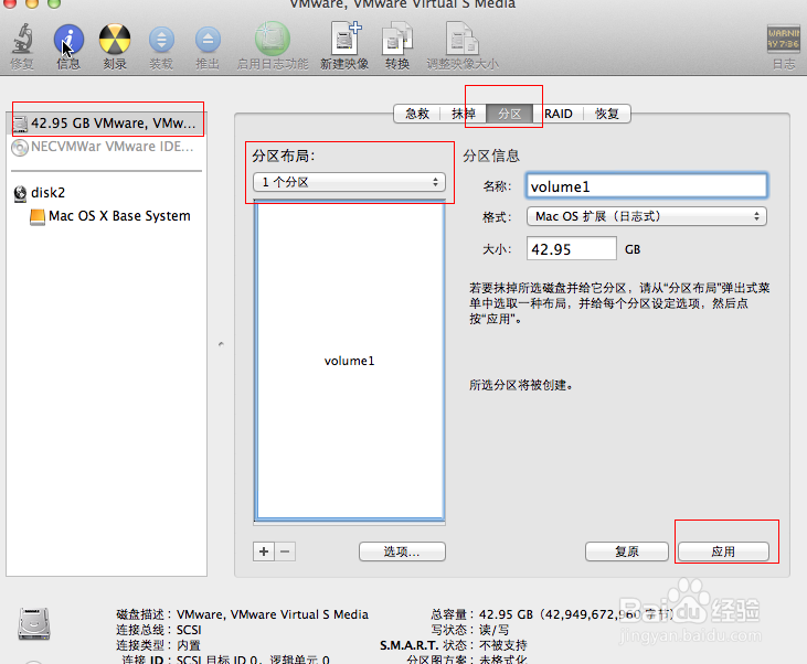 选择磁盘,分区->分区布局->1个分区->名称->应用。