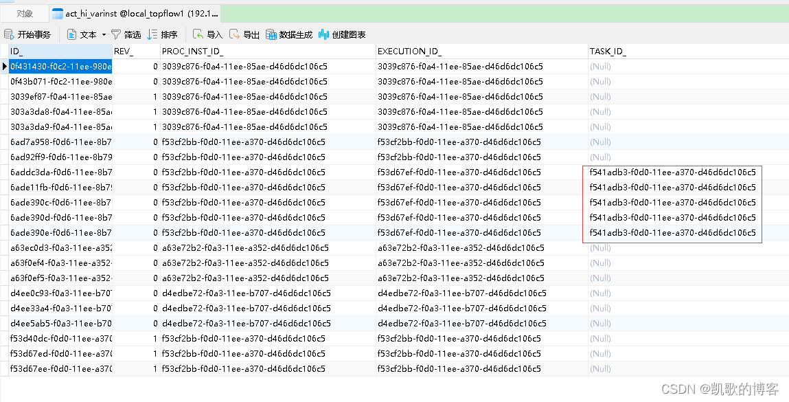 setVariableLocal:设置任务变量的时候,如果一个流程中存在2个活动节点,任务节点中相同变量互不影响, 不会相互替换. (可以看到TASK_ID的字段会存放任务ID的值)。